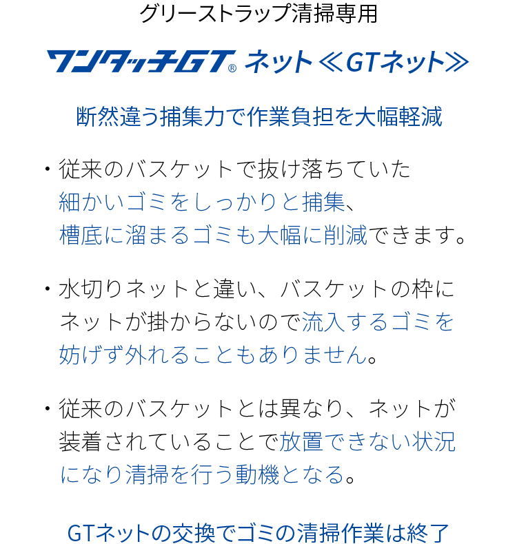 人がいない。 時間がない。 それでも、 ワンタッチGTがある。 「清掃時間3分」 会社概要 製品一覧 ワンタッチGTバスケット型 ワンタッチGTアタッチメント型 丸形流入口専用スライド型 油吸着材その他の関連製品 バスケット型 浅型 ・ 中深型グリーストラップに対応GTネット 目合い 約 0.5~1.7mm特許出願中 ・ 意匠登録済 ・ 商標登録済 アタッチメント型 中深型 ・ 幅広グリーストラップに対応GTネット 目合い 約 0.1~0.8mm特許出願中 ・ 意匠登録済 ・ 商標登録済 油が多い場合はそのまま使用します はがして2枚にすることで 油が少ない場合や時短清掃で使用します 業種別導入メリット 商業施設 ・ ビル施設管理 スーパーマーケット 飲食店 ・ ベーカリー ホテル ・ 給食 ・ 食品工場 お知らせ 2026.03.01 弊社営業日 3月・4月 営業日カレンダー お問い合わせはこちら 製品のご注文はこちら